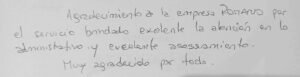 «Agradecimiento a la empresa ROMANO por el servicio brindado, excelente la atención en lo administrativo y excelente asesoramiento. Muy agradecido por todo»